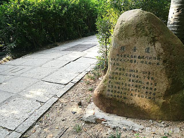 1、 鼓浪屿现在是一座旅游岛,岛上有自然景观,有人文景点,也有不少纪念名人志士的场所,比如最大手笔的纪念就是郑成功,鼓浪屿上面有郑成功纪念馆,有 皓月园,还有日光岩景区的龙头山寨、水操台等,整座鼓浪屿,取个别号叫“郑成功纪念岛”并不会有什么违和感。 ,有马约翰纪念广场,还有马约翰纪念馆;第三手笔的纪念是林巧稚,位于漳州路和复兴路结合地带的毓园,是鼓浪屿为林巧稚修建的纪念公园。 今天要说的 拼音小道,应该是鼓浪屿纪念一个杰出人物手笔第四大的。拼音小道是纪念谁呢?纪念我国 语文现代化运动的先驱卢戆章先生。 鼓浪屿鼓声路的鼓浪石附近,树立着一尊卢戆章的雕像,介绍是这样写的:“ 卢戆章(1854-1928),厦门同安人,居住鼓浪屿,语言学家。1892年在厦门首创切音新字,开中国拼音字母之先河,并在推广京音统一语言,推行白话口语,使用简体汉字,提倡新式标点,实行横排横写等方面,贡献卓著,是中国语文现代化运动的先驱。” 这尊雕像的旁边,就是拼音小道的起点。